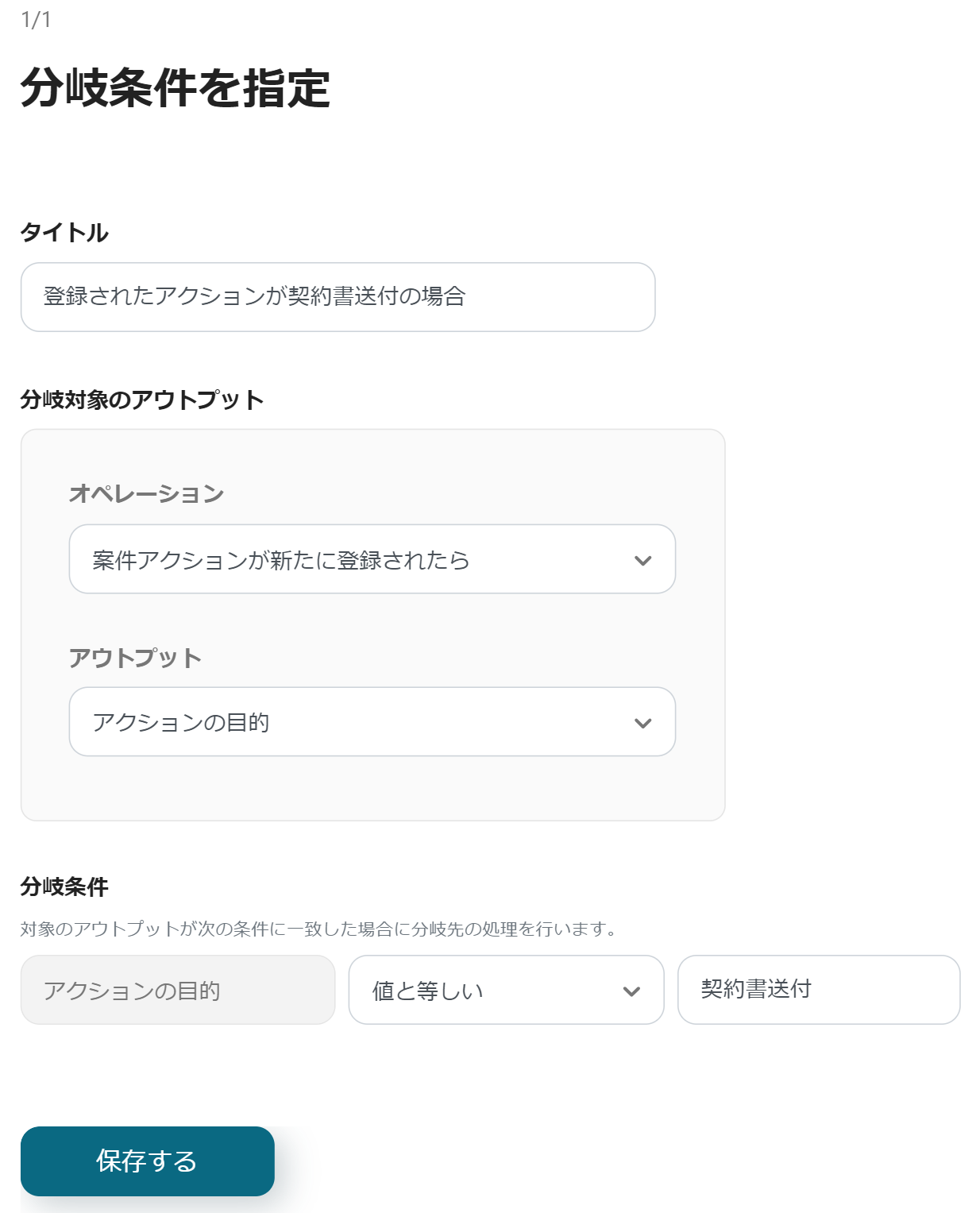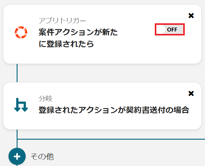 続いては分岐のオペレーションを利用し、契約書送付の場合とそうでない場合とで分ける設定を行います。