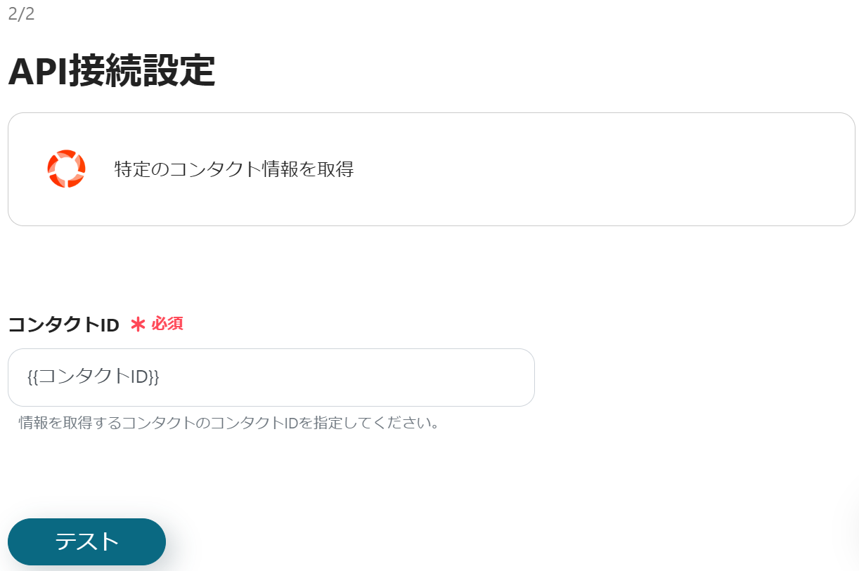以下の画面が表示されるので、「コンタクトID」が{{コンタクトID}}となっているか確認し、「テスト」→「テスト成功」→「保存」をクリックします。