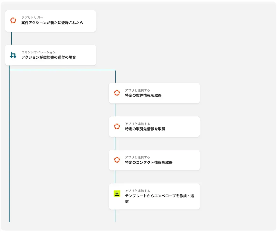 たとえば、Mazricaの案件アクションが登録された際に、DocuSignで契約書を作成して発行するフローの自動化ができます。