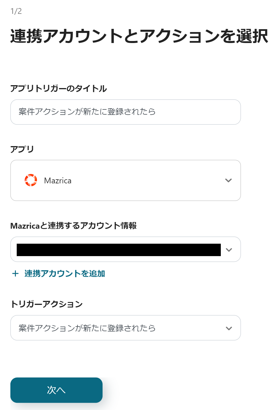 先にMazricaの設定から行うので、「案件アクションが新たに登録されたら」をクリックしてください。
