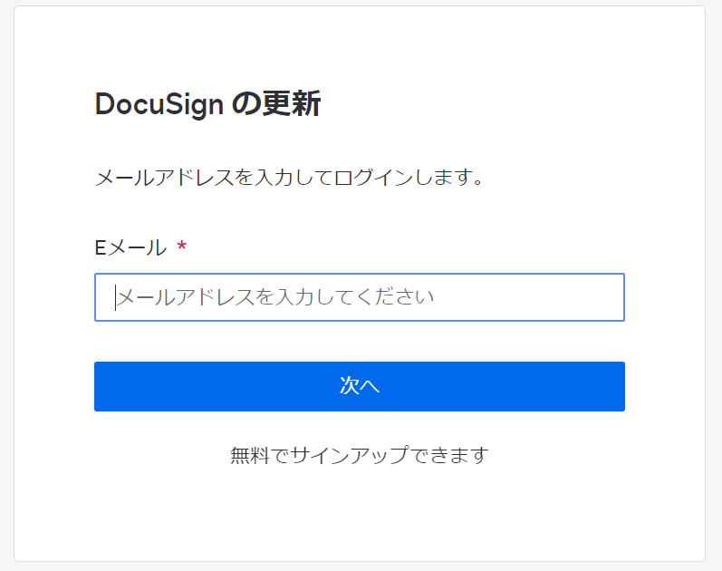 以下の画面が表示されたら、DocuSignにログインしましょう。