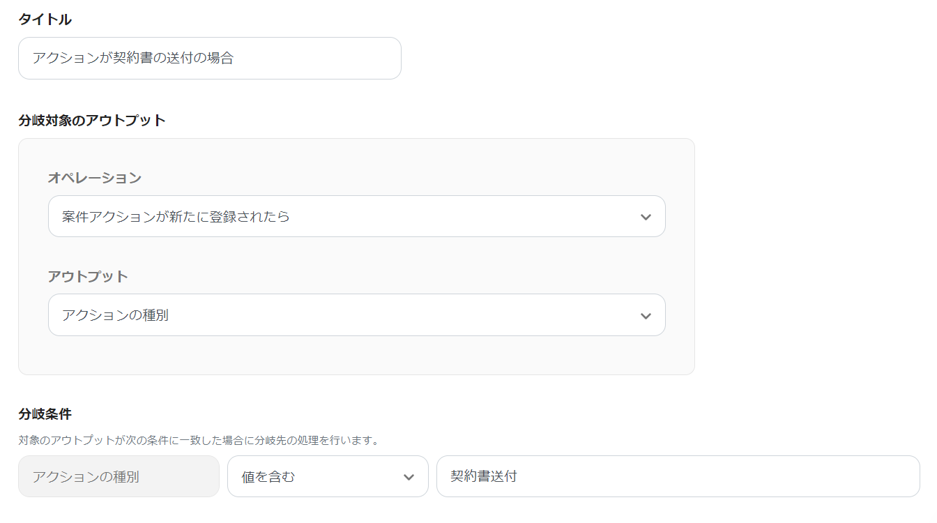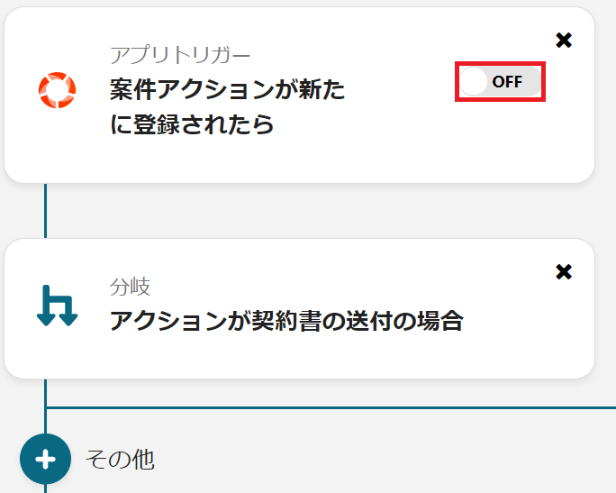 次にYoomの分岐のオペレーションを利用して、契約書送付の場合とそうでない場合とで分ける設定をします。