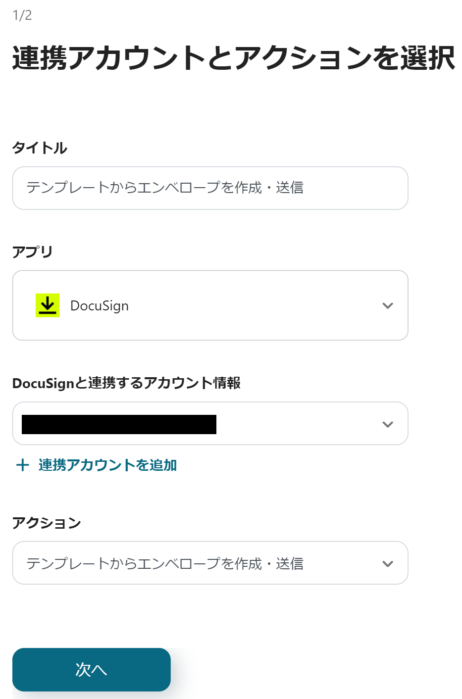 続いてDocuSignの設定を行うので、「テンプレートからエンベロープを作成・送信」をクリックしましょう。