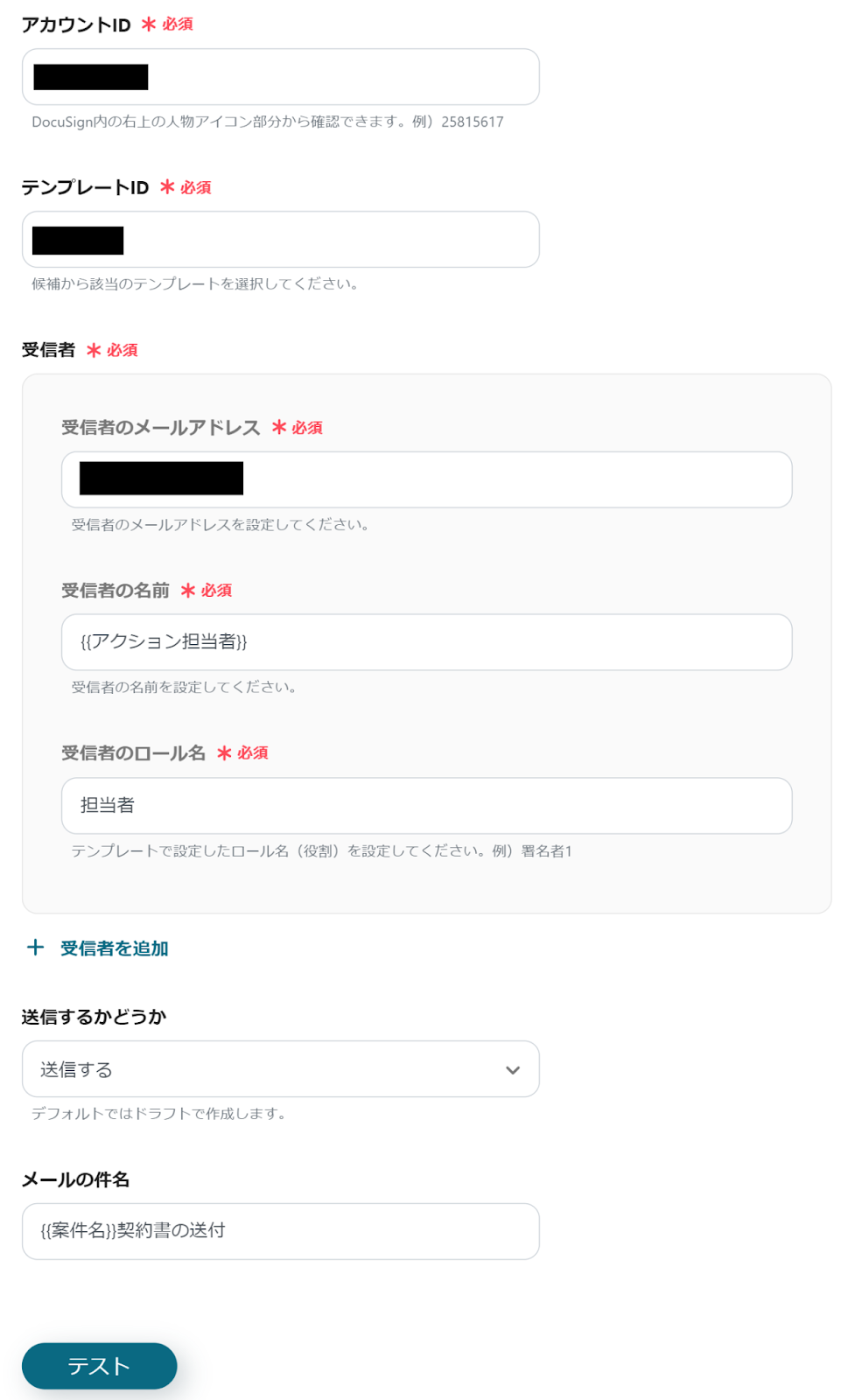 「アクションが契約書の送付の場合」をクリックし、下記の設定を確認してください。