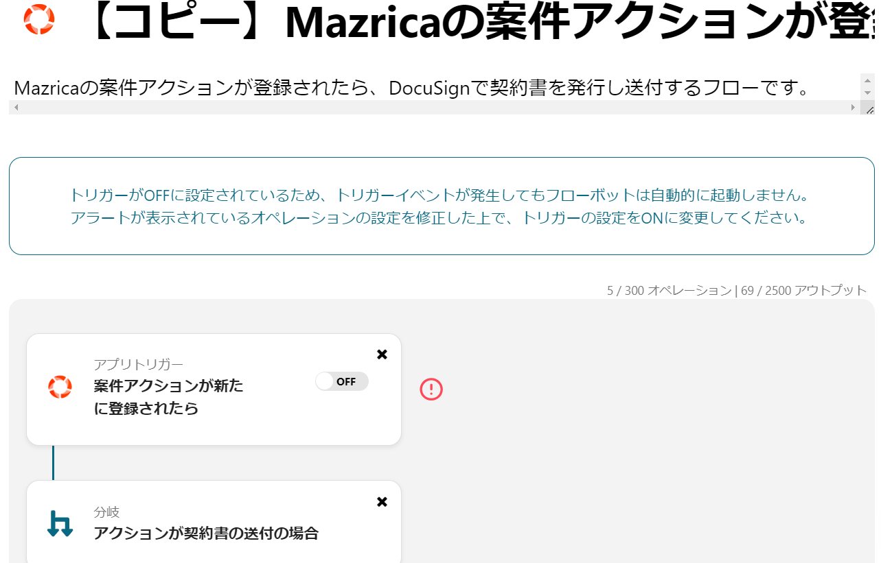 本記事では「Mazricaの案件アクションが登録されたら、DocuSignで契約書を発行し送付する」フローをご紹介します。