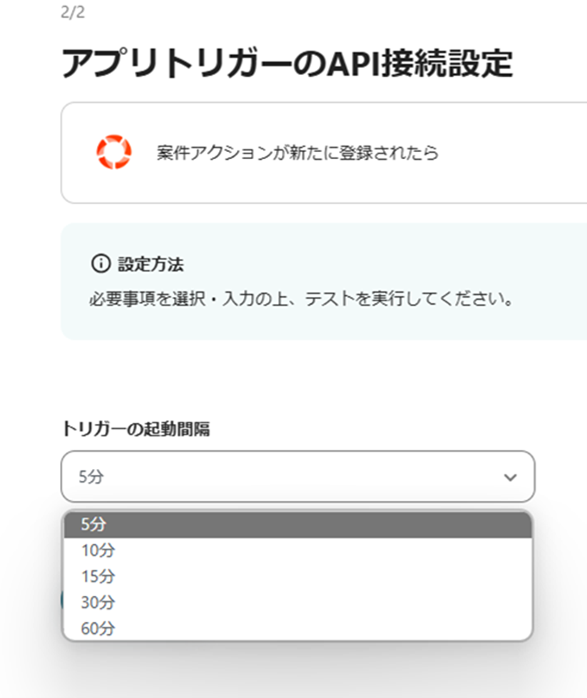 (3)アプリトリガーのAPI接続設定画面にてトリガー起動間隔を選択します。選択が完了したら、「テスト」をクリックし、エラーとならなければ、「保存する」をクリックします。