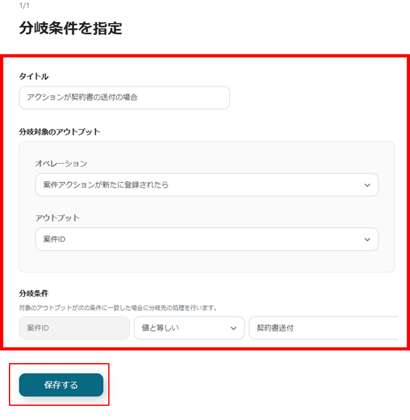 (2)分岐条件を指定画面がでるので、分岐対象のアウトプットをプルダウンより選択します。入力が完了したら、「保存する」をクリックします。