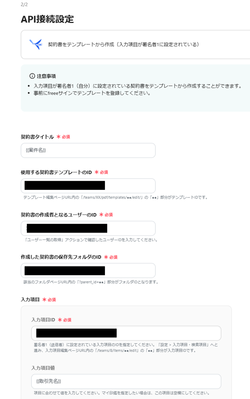 ※契約書の作成者となるユーザーのID:「ユーザー一覧の取得」アクションで確認したユーザーIDを入力してください。