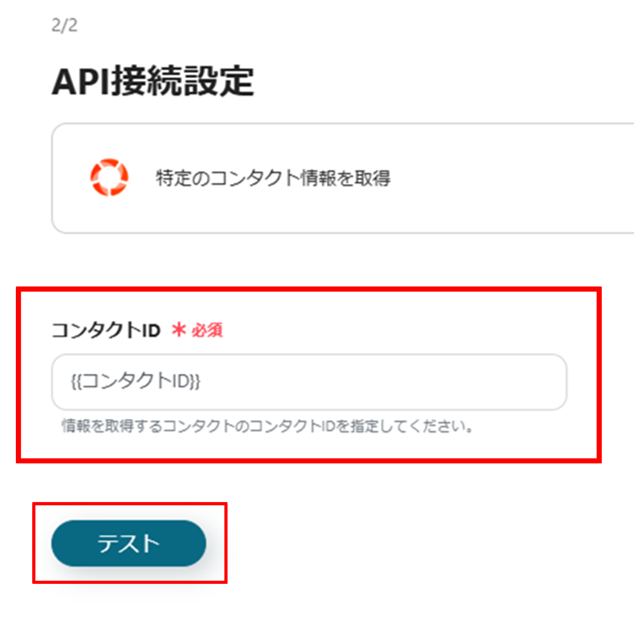 (11)API接続設定画面が出てくるので、コンタクトIDをアウトプットより選択し、「テスト」をクリックします。エラーとならなければ、「保存する」をクリックします。