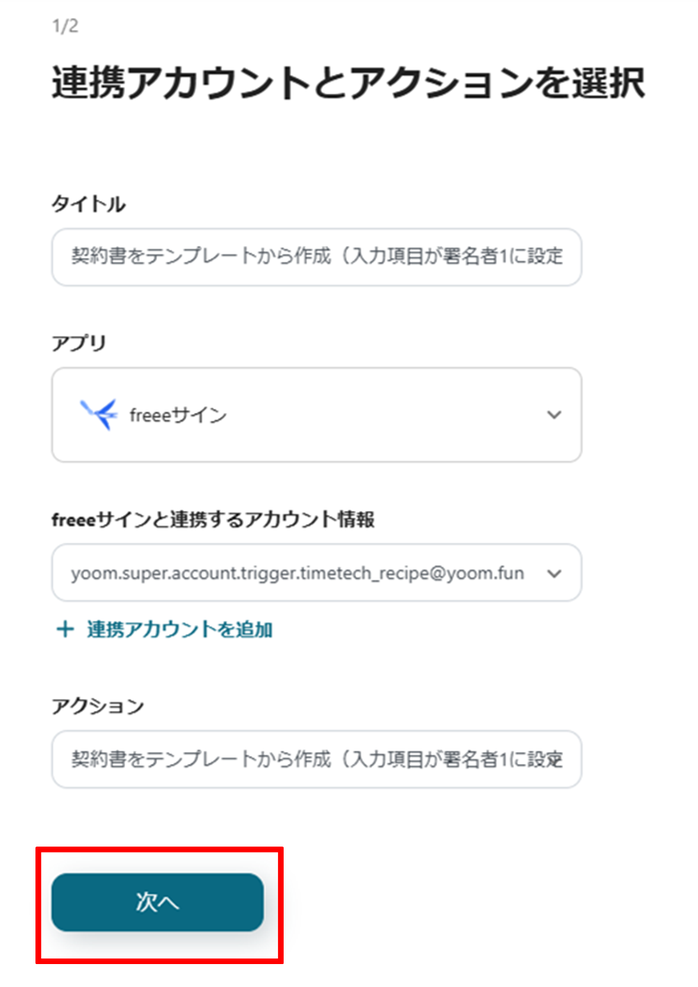 (13)連携アカウントとアクションを選択画面が出てくるので、freeeサインと連携するアカウント情報に誤りがないかを確認し、アクションは「契約書をテンプレートから作成(入力項目が署名者1に設定されている)」のままで「次へ」をクリックします。