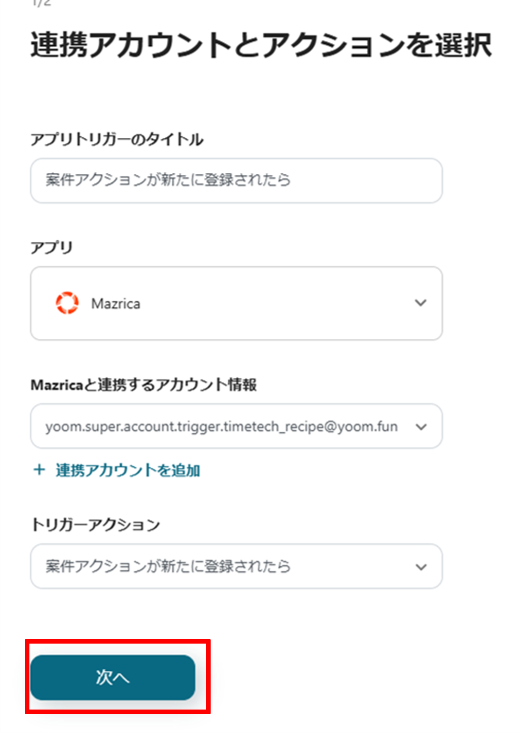 (2)連携アカウントとアクションを選択画面にて、Mazricaと連携するアカウント情報に誤りがないかを確認し、トリガーアクションは「案件アクションが新たに登録されたら」のままで「次へ」をクリックします。