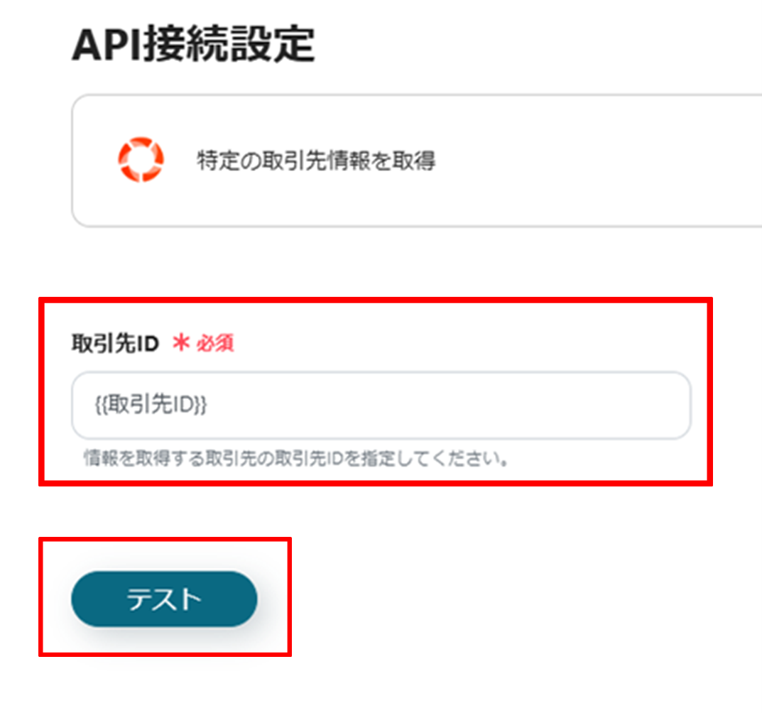 (8)API接続設定画面が出てくるので、取引先IDをアウトプットより選択し、「テスト」をクリックします。エラーとならなければ、「保存する」をクリックします。