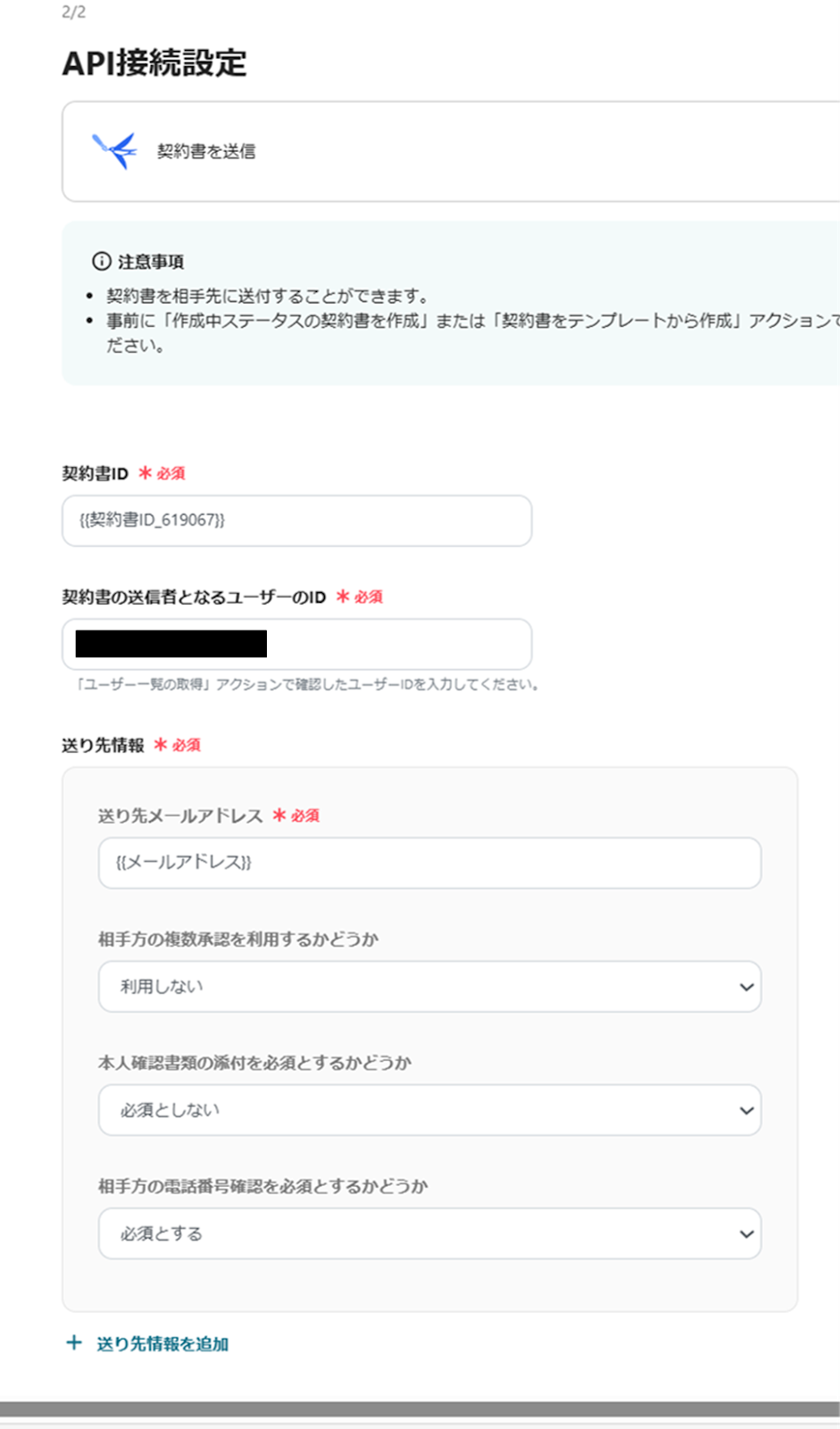 ※契約書の送信者となるユーザーのIDには「ユーザー一覧の取得」アクションで確認したユーザーIDを入力してください。