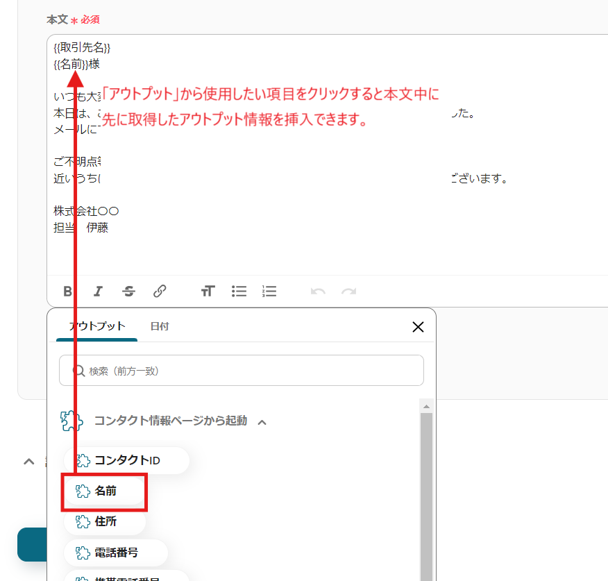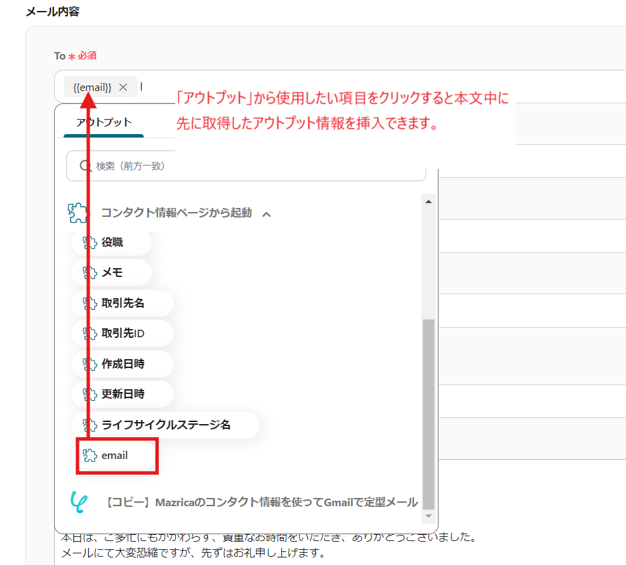 7) 各項目を入力します。連携済みのMazricaのアウトプット情報を活用できるので、宛先やメッセージ本文の作成時には必要に応じて引用してください。