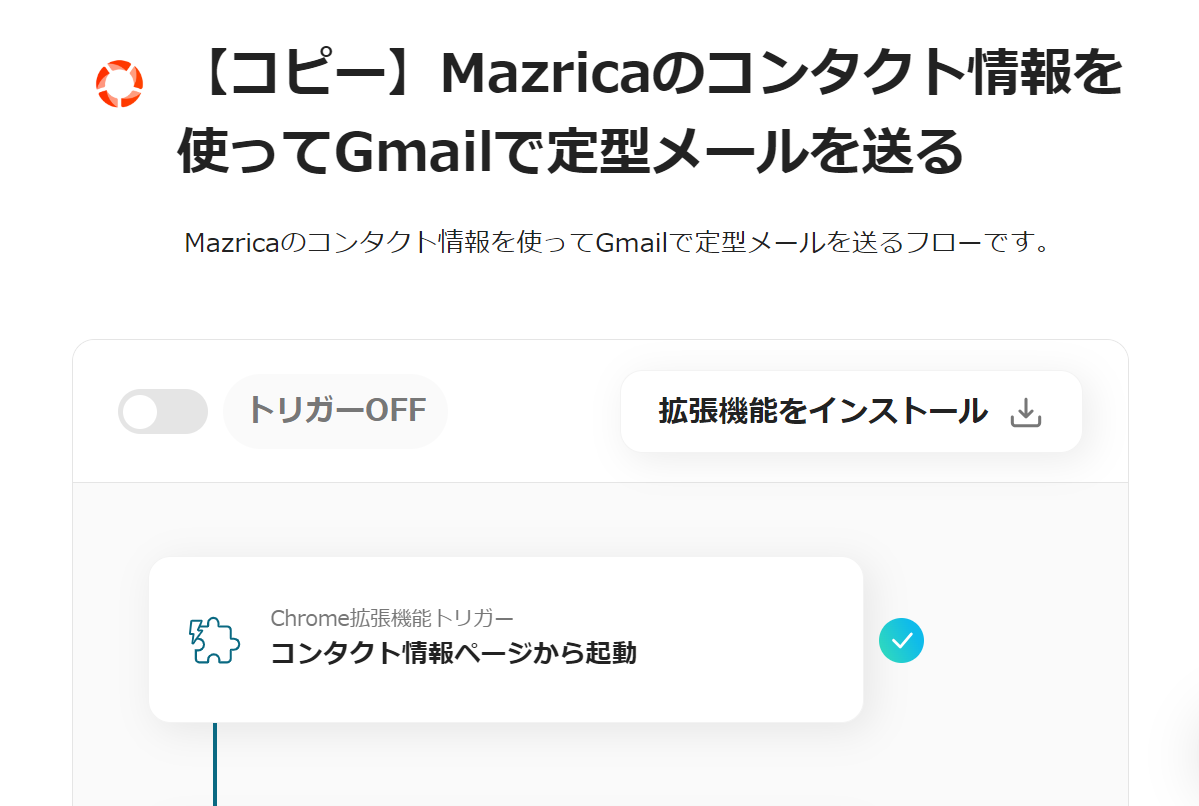今回は、【Mazricaのコンタクト情報を使ってGmailで定型メールを送る】というフローを作成します。Mazricaのコンタクトページから自動で定型メールを送付できるため、手作業でメールを送る手間を省き、業務の効率化向上が見込めます。