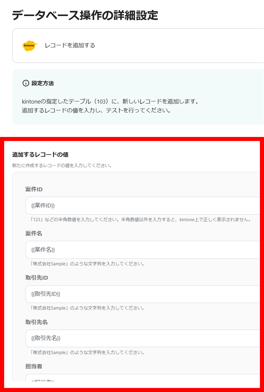 ただしカスタムフィールドによっては、オペレーション設定時に行うテストの後に、取得した値に自分で追加する必要があるため注意してください。