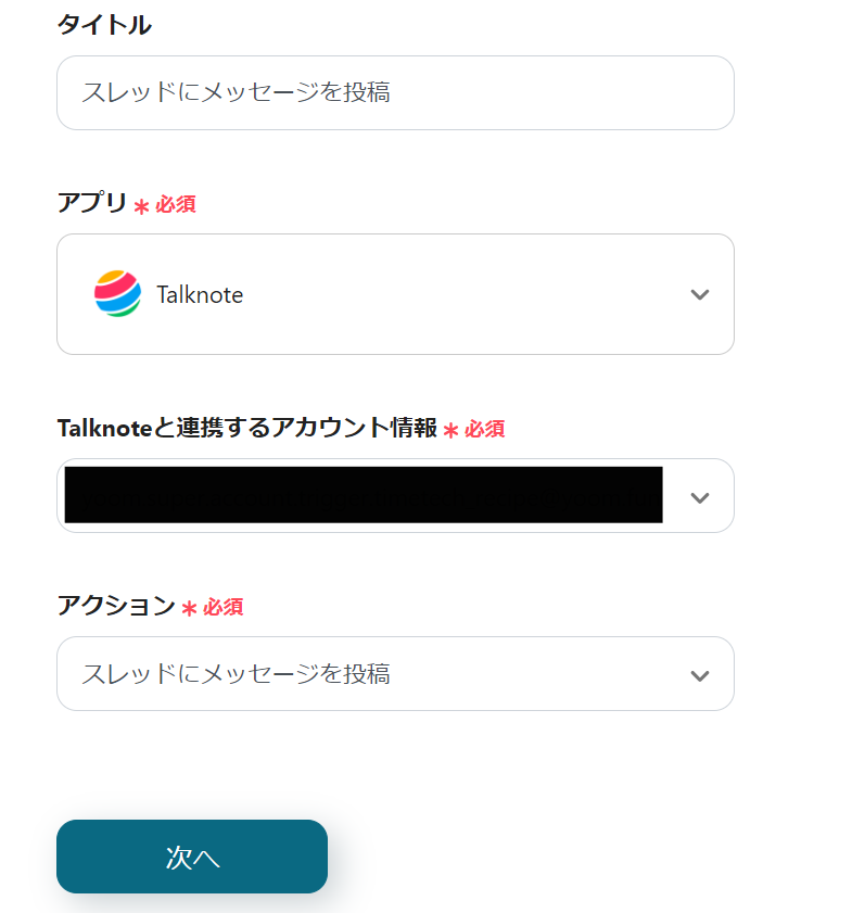 7)アクションは「スレッドにメッセージを投稿」を選択して、「次へ」をクリックします。
