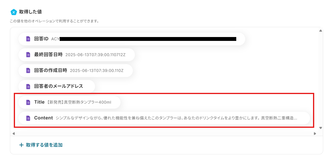 これらの値は、以降のアクションで変数として使用できるようになります。