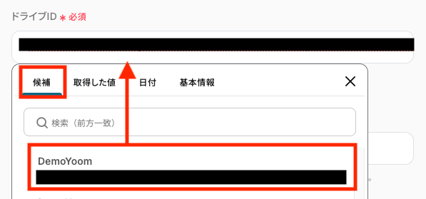 ドライブID・アイテムID・シート名は、それぞれ以下のように入力欄をクリックして、表示された候補から選択します。