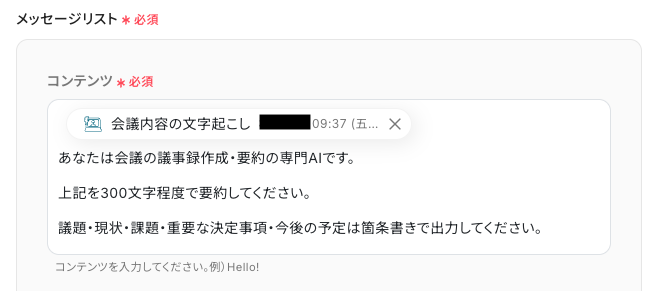 コンテンツには、ステップ3で取得した「会議内容の文字起こし」がすでに入力されています。 ここに加えて、どのように要約するか指示となるプロンプトを入力しましょう。