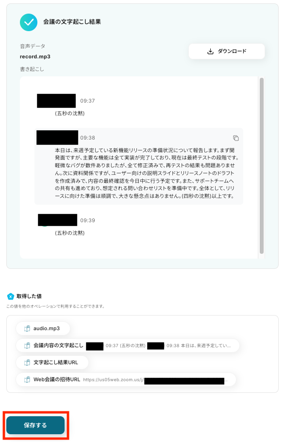 その後、自動で文字起こしが開始され、以下のように取得した値が表示されます。