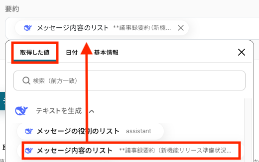 要約内容を入力する場合は、「取得した値」タブの「テキストを生成」から「メッセージ内容のリスト」を選びます。 取得した値を活用することで、固定値ではなく、トリガーが実行されるたびに最新の情報が反映できます。