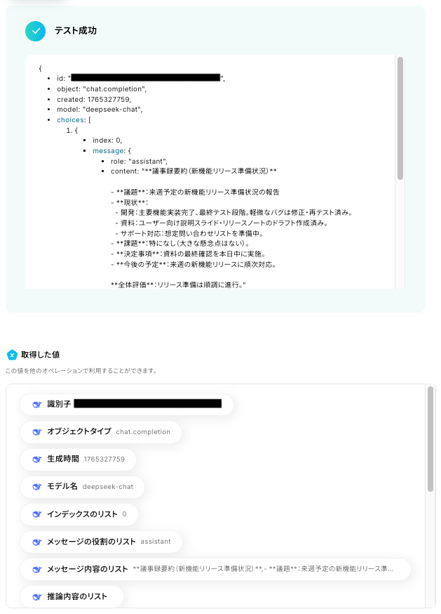 DeepSeekのテキスト生成アクションでは、使用するモデルIDや、どのような要約内容を生成させたいかに応じてメッセージリスト(プロンプト)を任意で設定してください。 Google スプレッドシートの「レコードを更新する」アクションでは、更新対象のスプレッドシートID、シートID、および要約結果を書き込む列の値を任意で設定してください。 ■注意事項