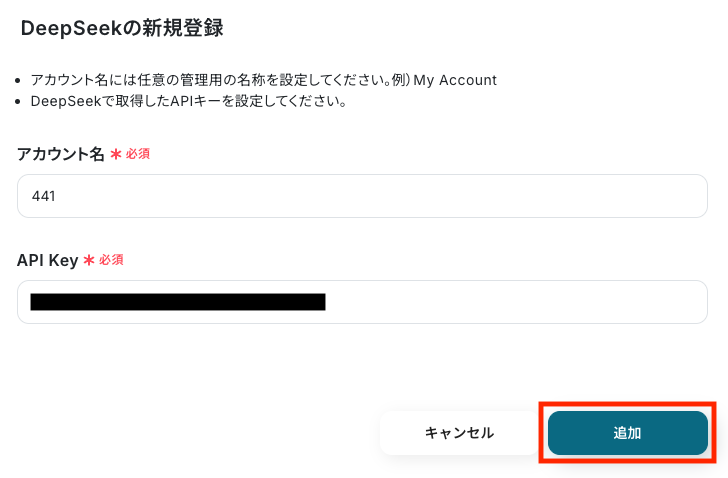 Yoomの画面に戻り、コピーしたAPIキーを「API Key」欄に貼り付けます。 任意のアカウント名を入力したら、「追加」をクリックしてください。