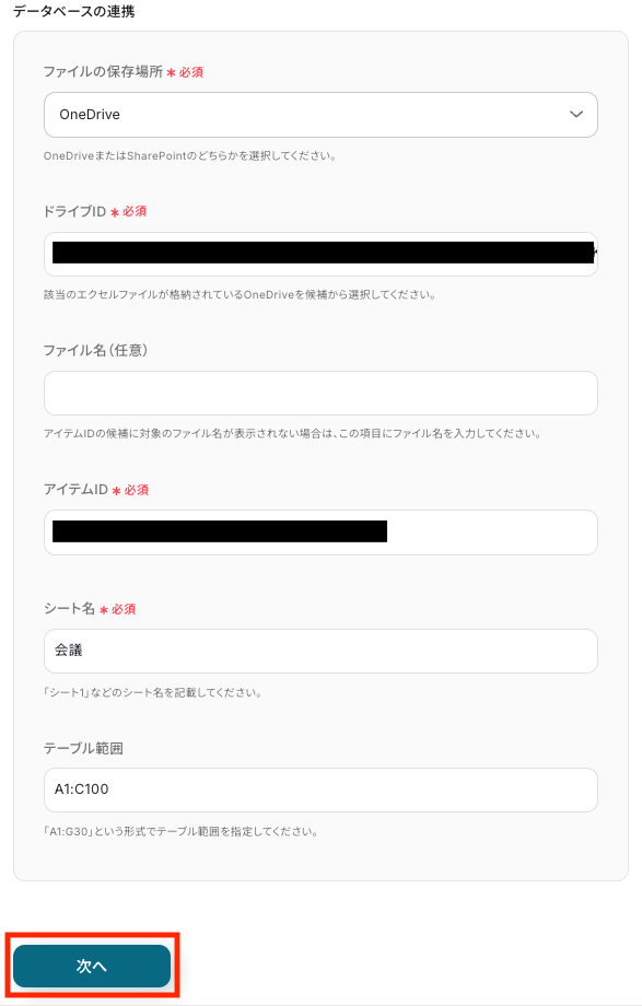 テーブル範囲は連携するファイルに合わせて、ヘッダ行を含めた範囲を指定してください。 設定が完了したら、次へ進みましょう。