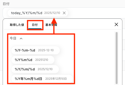 たとえば、日付を入力する場合は、「日付」タブから選択します。 フォーマットは、自社の運用ルールに合わせて選んでください。
