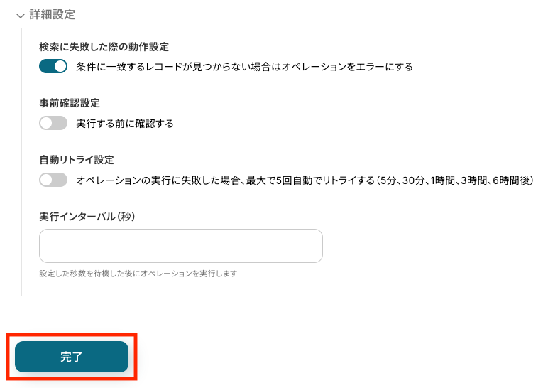 必要に応じて詳細設定を行い、「完了」をクリックします。
