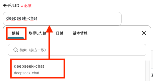 モデルIDの入力欄をクリックし、表示された候補の中から使用したいモデルを選択してください。