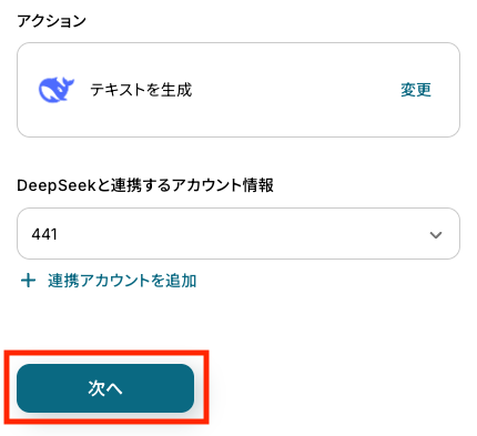 アカウント情報:ステップ1で連携したアカウントが自動で選択されています。別のアカウントを使用したい場合は、「+ 連携アカウントを追加」から変更可能です。