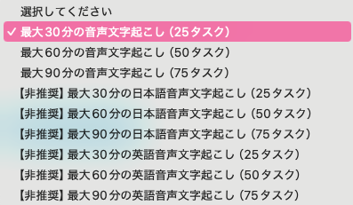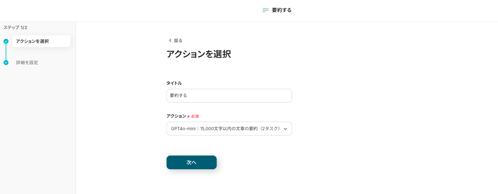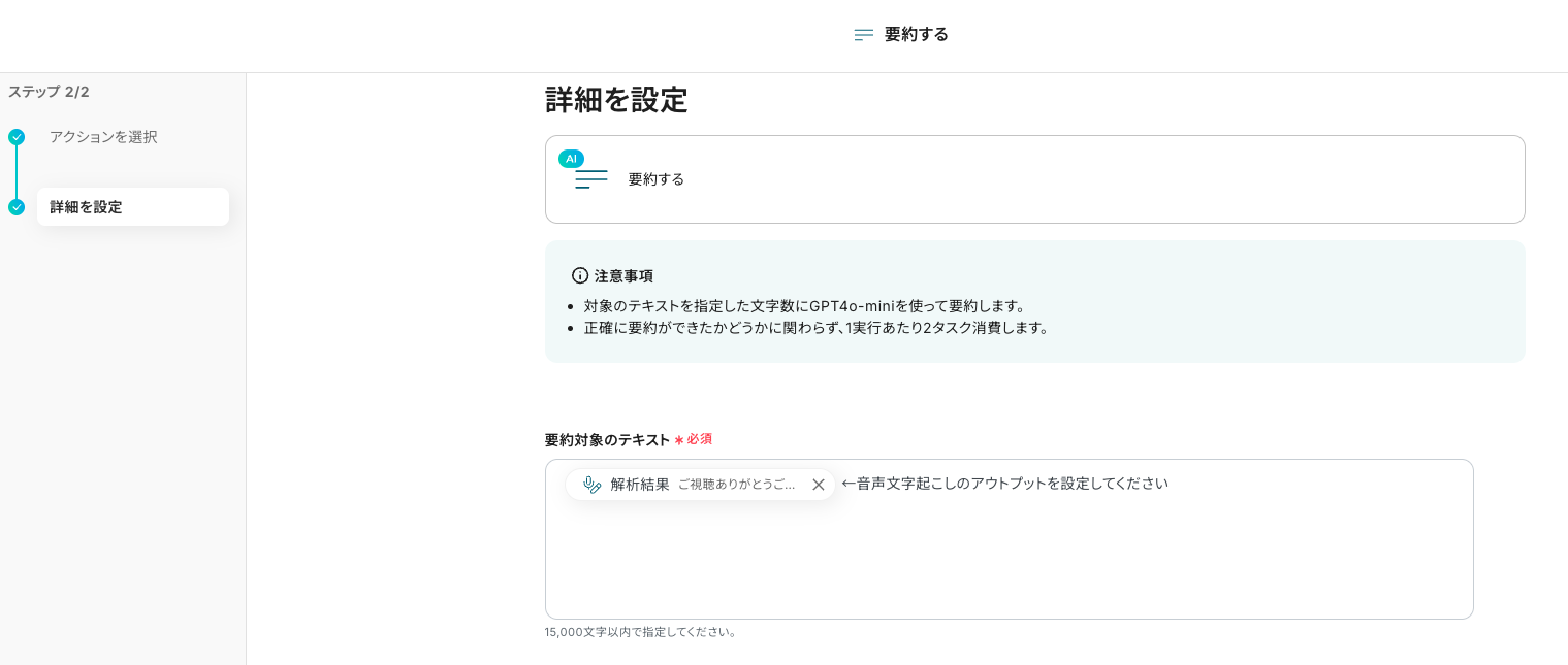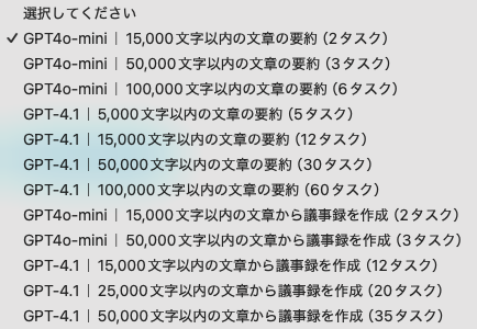 - アクションは以下の内容から選べます。こちらもAIのタイプと文字量で消費タスクが変わります。後からでも変更できるので、事前設定のまま、一旦動かしてみましょう。