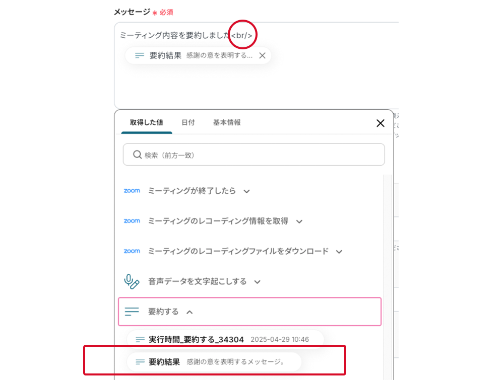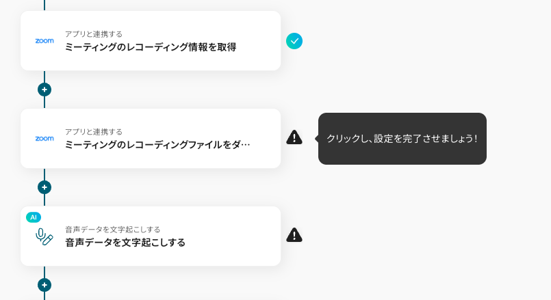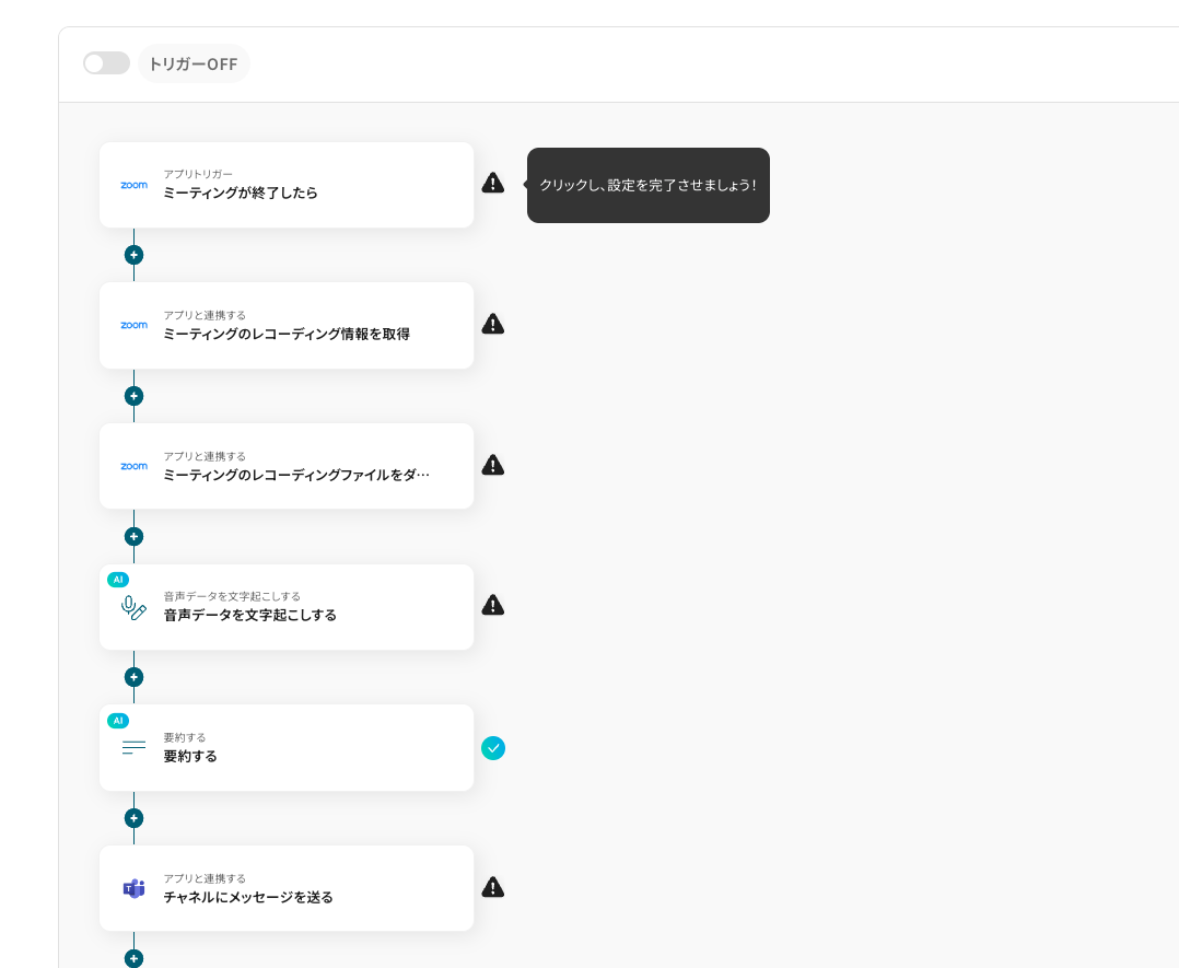- Zoomのトリガー設定、文字起こし・AI要約のアクション設定、Microsoft Teamsのアクション設定