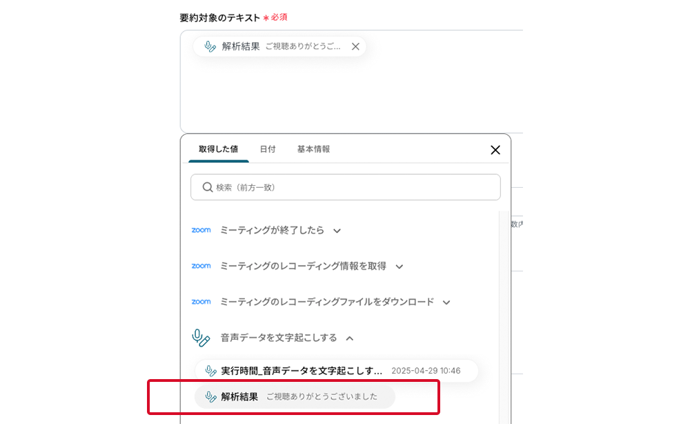 テンプレートの5つ目をクリックします。この工程では、文字起こし結果を要約する設定を行います。