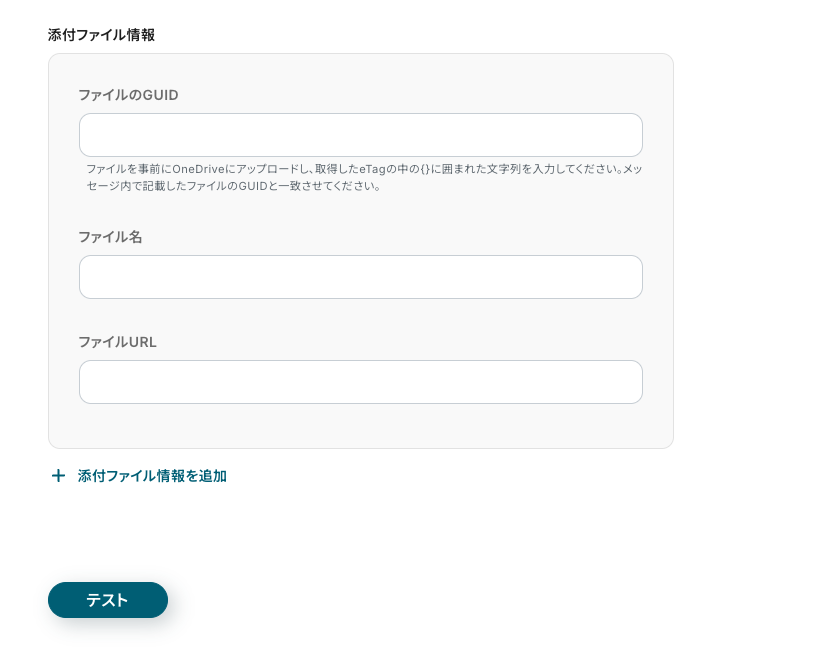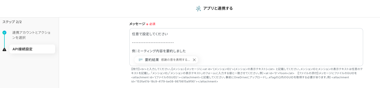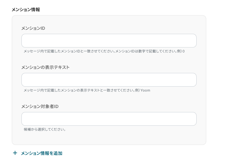 メンションを設定する場合は、メッセージ編集エリアの下の、メンション値を紐付けするボックスに値を入力します。添付ファイル情報も同じく値を挿入します。