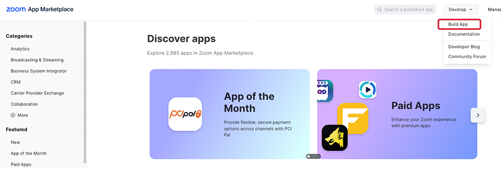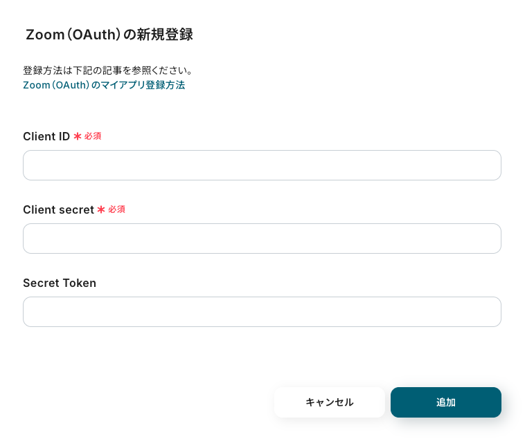 検索窓から「Zoom」を入力して、Zoom(OAuth)をクリックします。連携に必要な値の入力画面が表示されます。