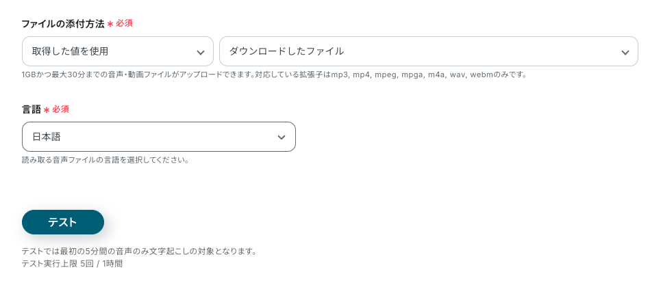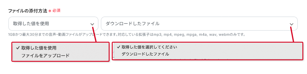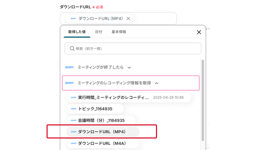 - 前の操作で取得したダウンロードデータを使用するため、プルダウンから「取得した値を使用」「ダウンロードファイル」を選択してください。