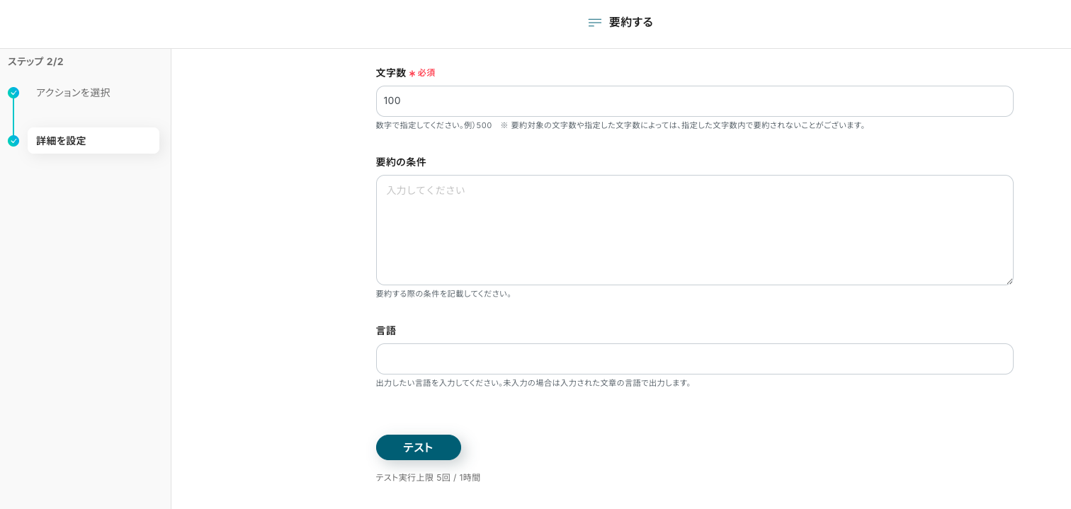 設定を確認したら、テストボタンをクリックします。成功すると、要約結果が取得できます。
