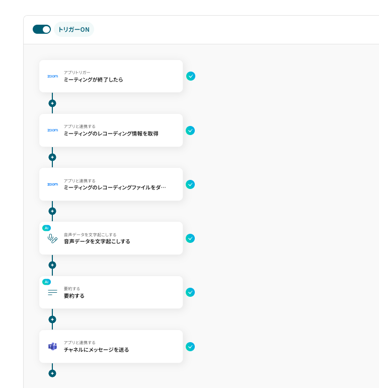 それではここから代表的な例として、Zoomでミーティングが終了したことをきっかけに、録画データから自動で文字起こしとAIによる要約を行い、その結果をMicrosoft Teamsに通知するフローの作り方を解説していきます!