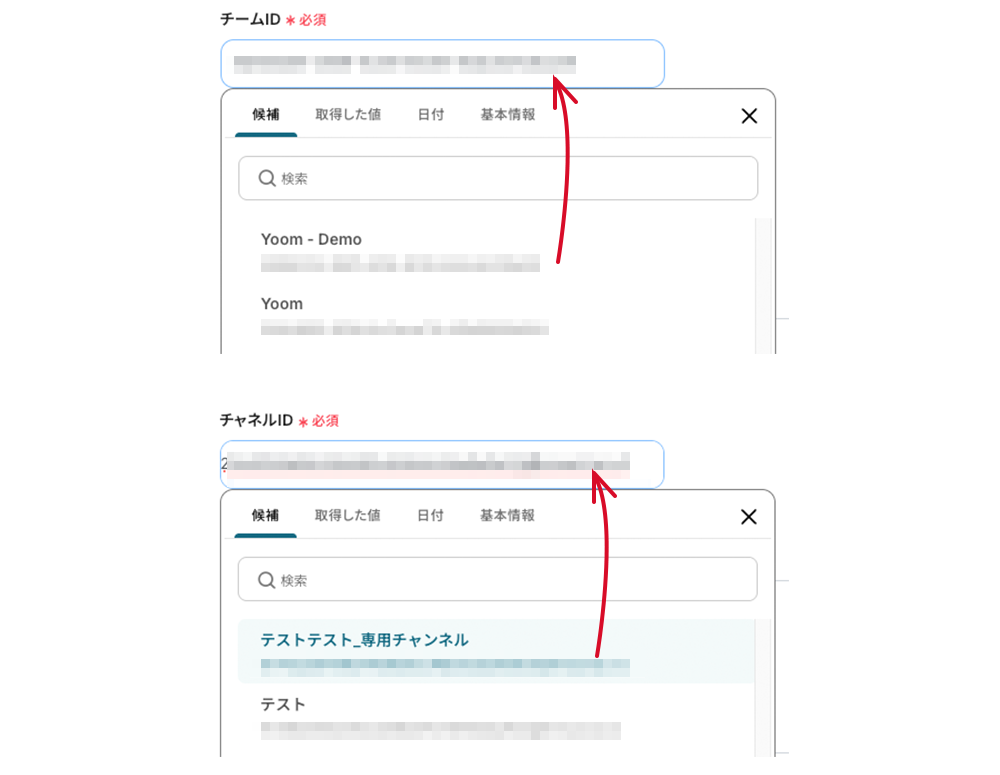 - どちらも、編集欄をクリックすると候補が表示されます。選択すると編集欄にIDが引用されます。