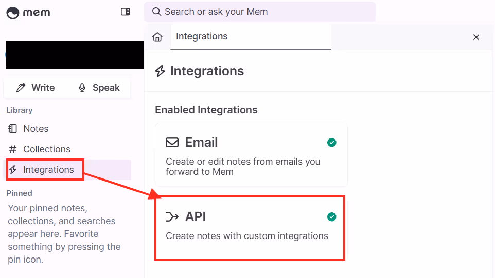 Memにログインしたら、「Integrations」から「API」をクリックすると、APIキーを発行可能です。