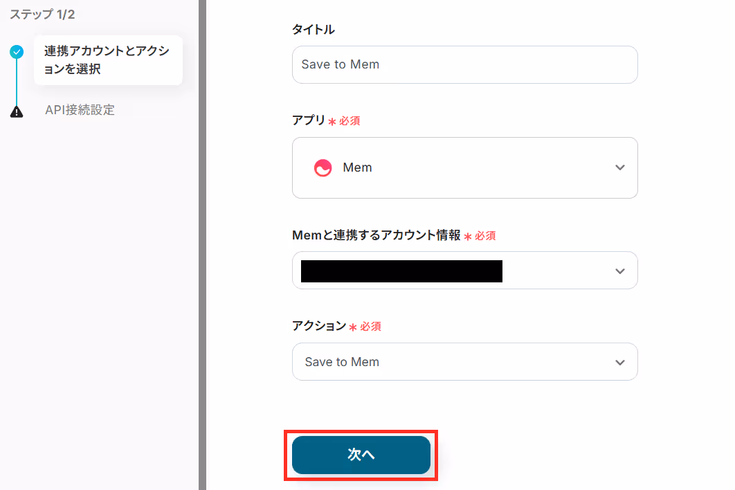 タイトルを任意で設定し、Memと連携するアカウントやアクション内容を確認したら「次へ」を押してください。
