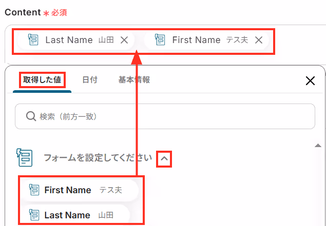 「Content」にはフォームから回答を得られた名前を、取得した値から選択しておきましょう。