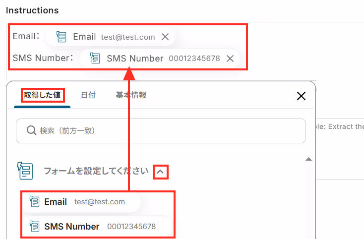 「Instructions」には、フォームから集めた他のメールアドレスや電話番号などの情報を、取得した値と手入力によるテキストを組み合わせて入力しておきます。
