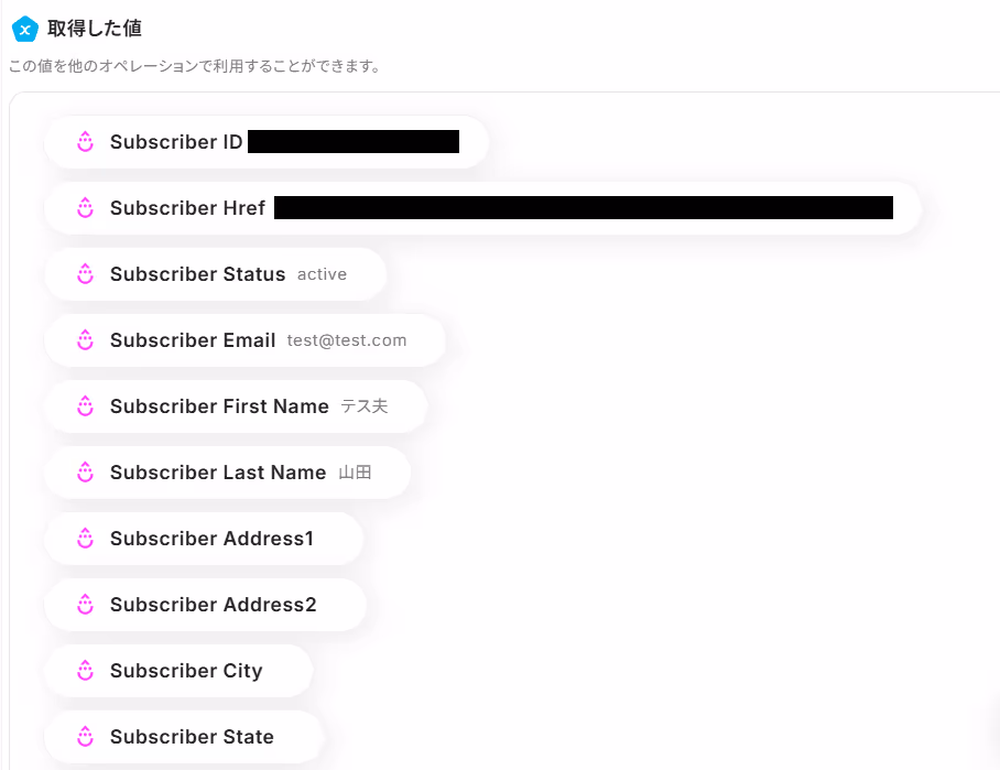必要な設定を終えたら、「テスト」ボタンをクリックしてください。取得した値に、Dripで新たに作成されたSubscriberの情報が反映されていれば成功です!