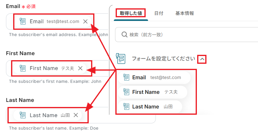 他にもフォームから集めた情報でDripに連携できるものがあれば、取得した値から設定していきましょう。 必要な設定を終えたら、「テスト」ボタンをクリックしてください。取得した値に、Dripで新たに作成されたSubscriberの情報が反映されていれば成功です!