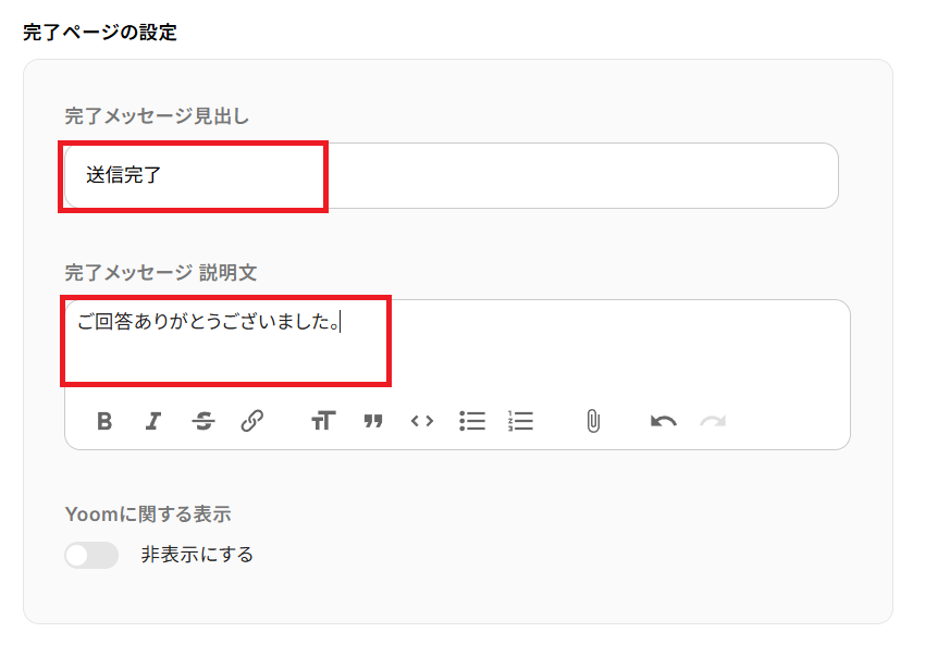各項目を設定したら、フォームを送信した後に表示される完了ページも設定しておきます。 表示されるテキストを入力してください。