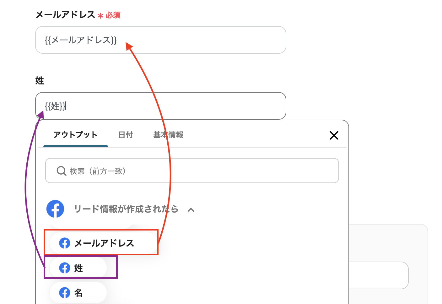 (以下は例として、前ステップで取得した「メールアドレス」、「姓」の情報を引用したものです。)